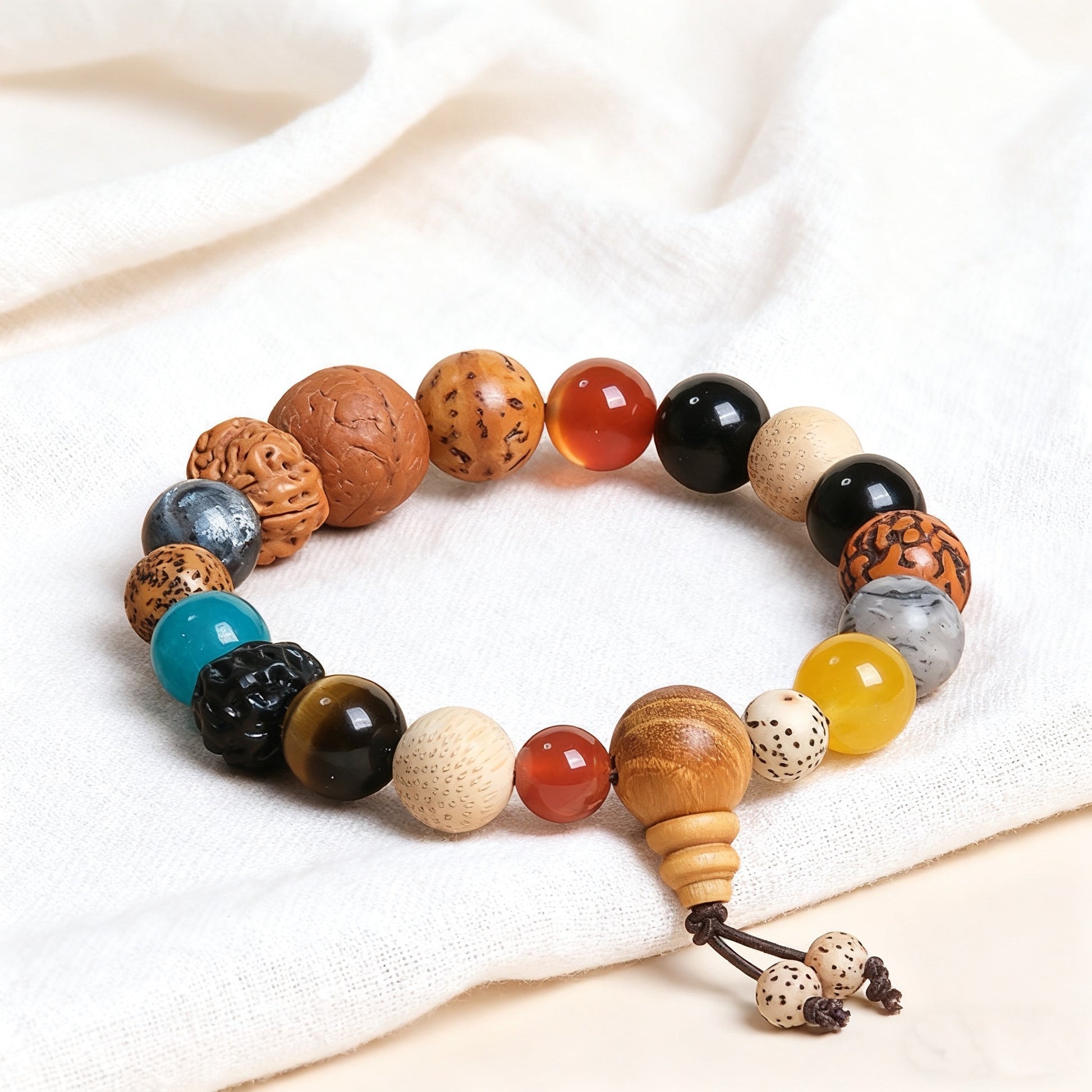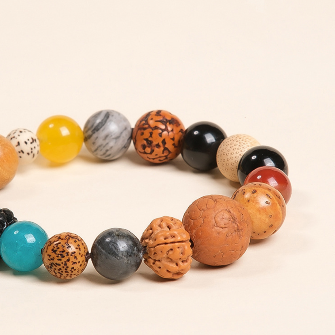 十八籽ブレスレットは、仏教で言われる「十八界」(六根・六塵・六識)に由来し、あらゆる物事からの解脱と智慧の完成を願う伝統的な吉祥物です。18種類の石が持つ多様なエネルギーが調和することで、あらゆる方面の運気(金運、健康運、恋愛運、仕事運など)をバランスよく高め、強い保護のエネルギーを発揮すると言われています。