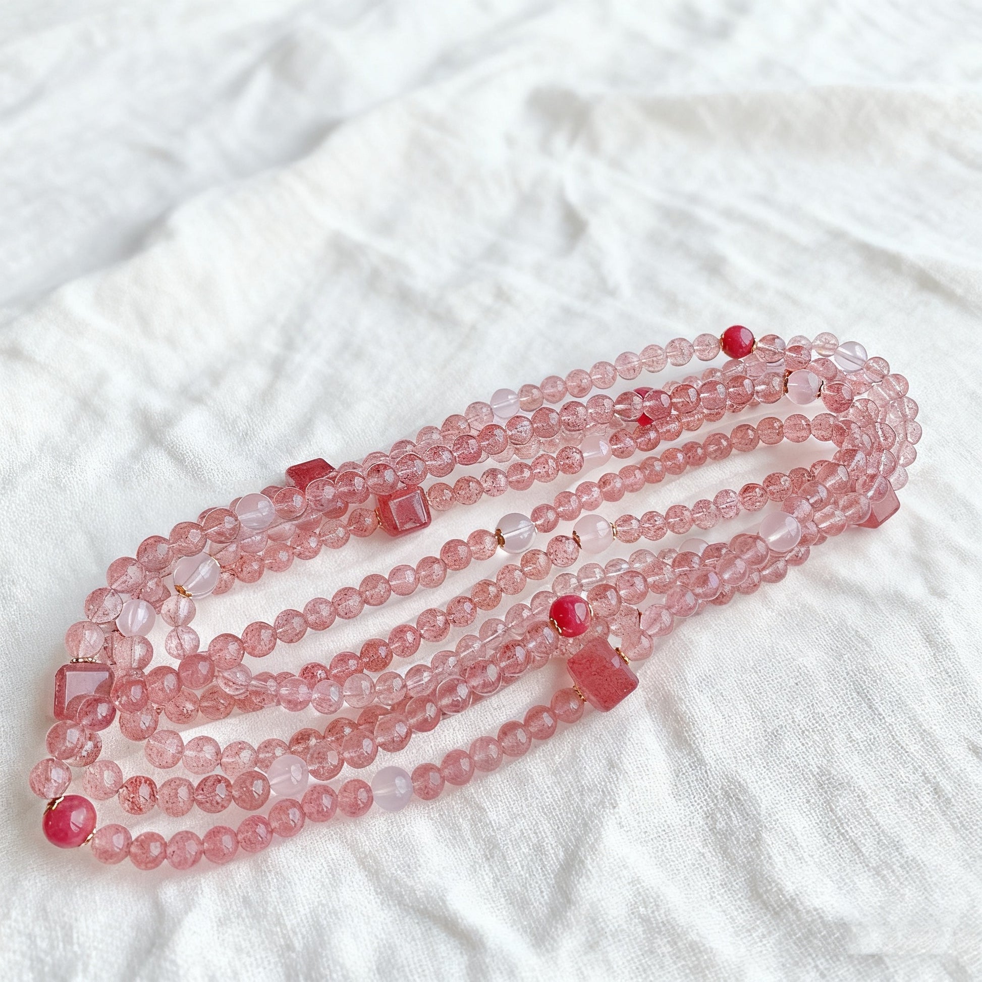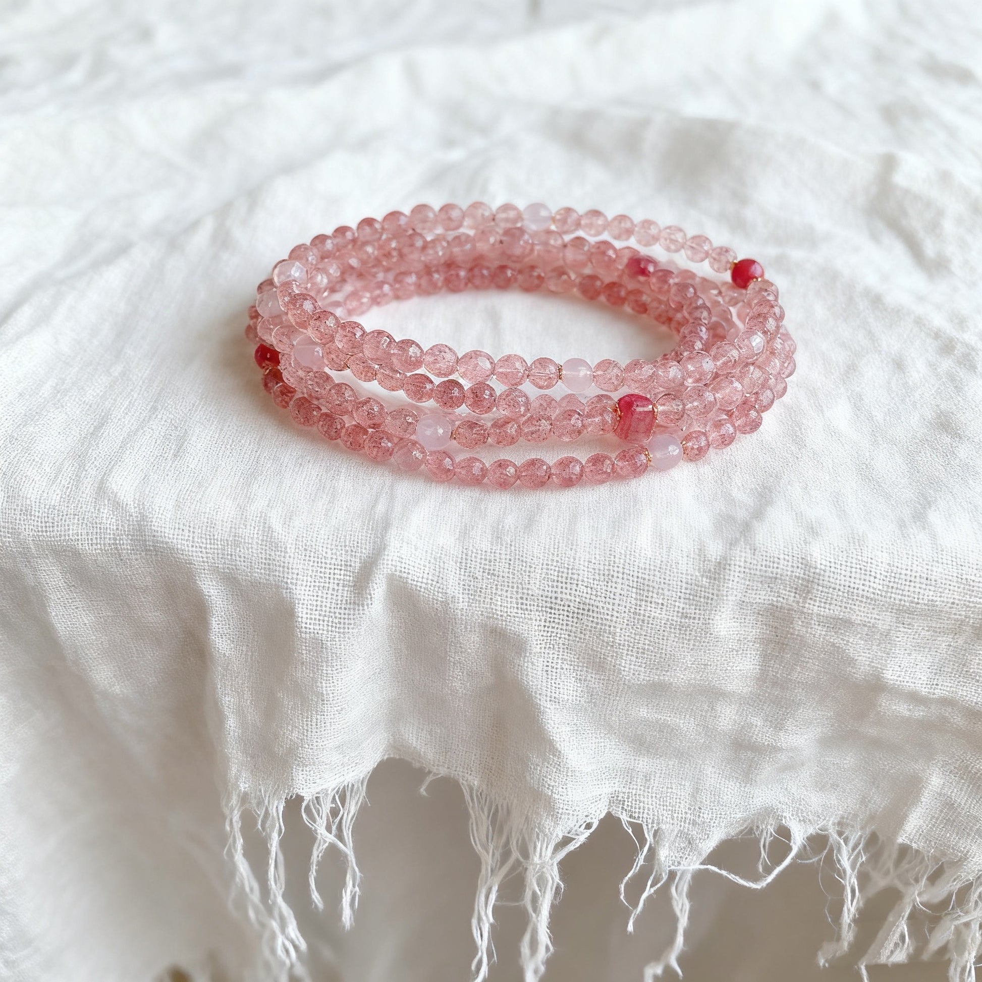 最高品質とされる濃厚な赤色「鳩血紅」のストロベリークォーツを使用した、最上級の恋愛運ブレスレット。ダブル巻きのパワフルなデザインが、強力な愛情エネルギーを呼び込み、理想の恋愛と結婚への道を切り開きます。