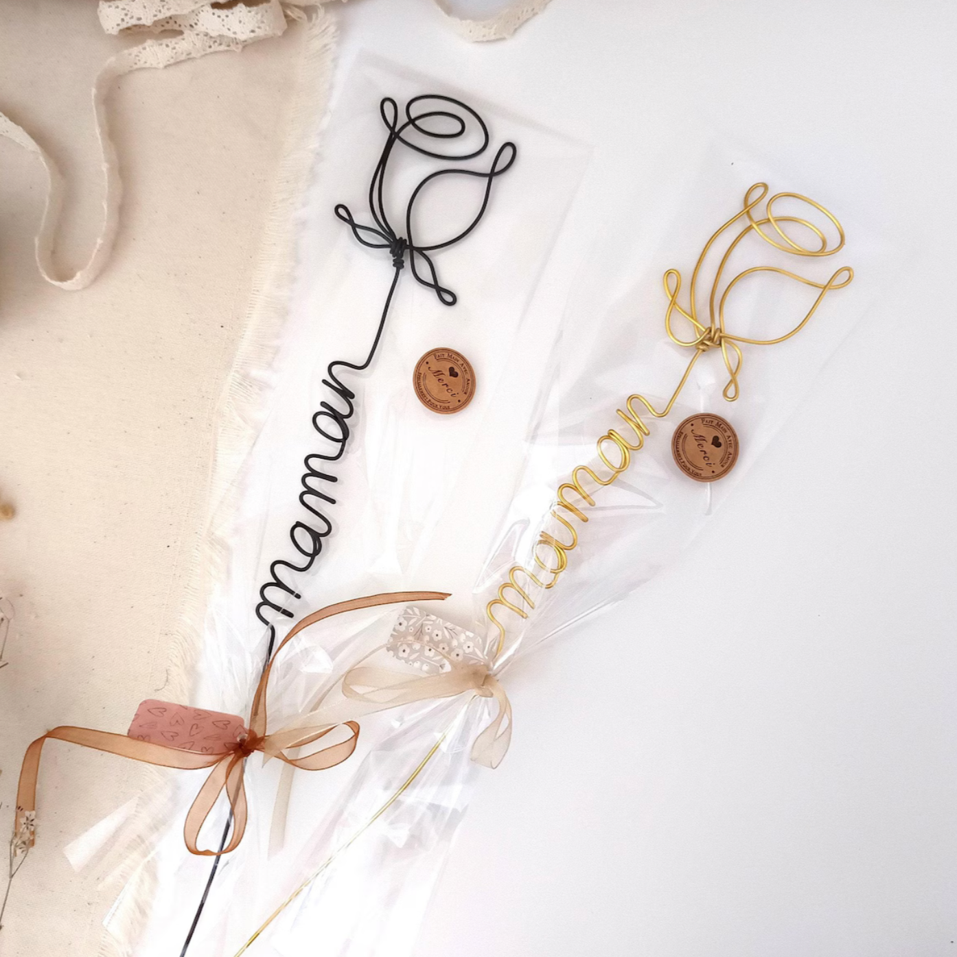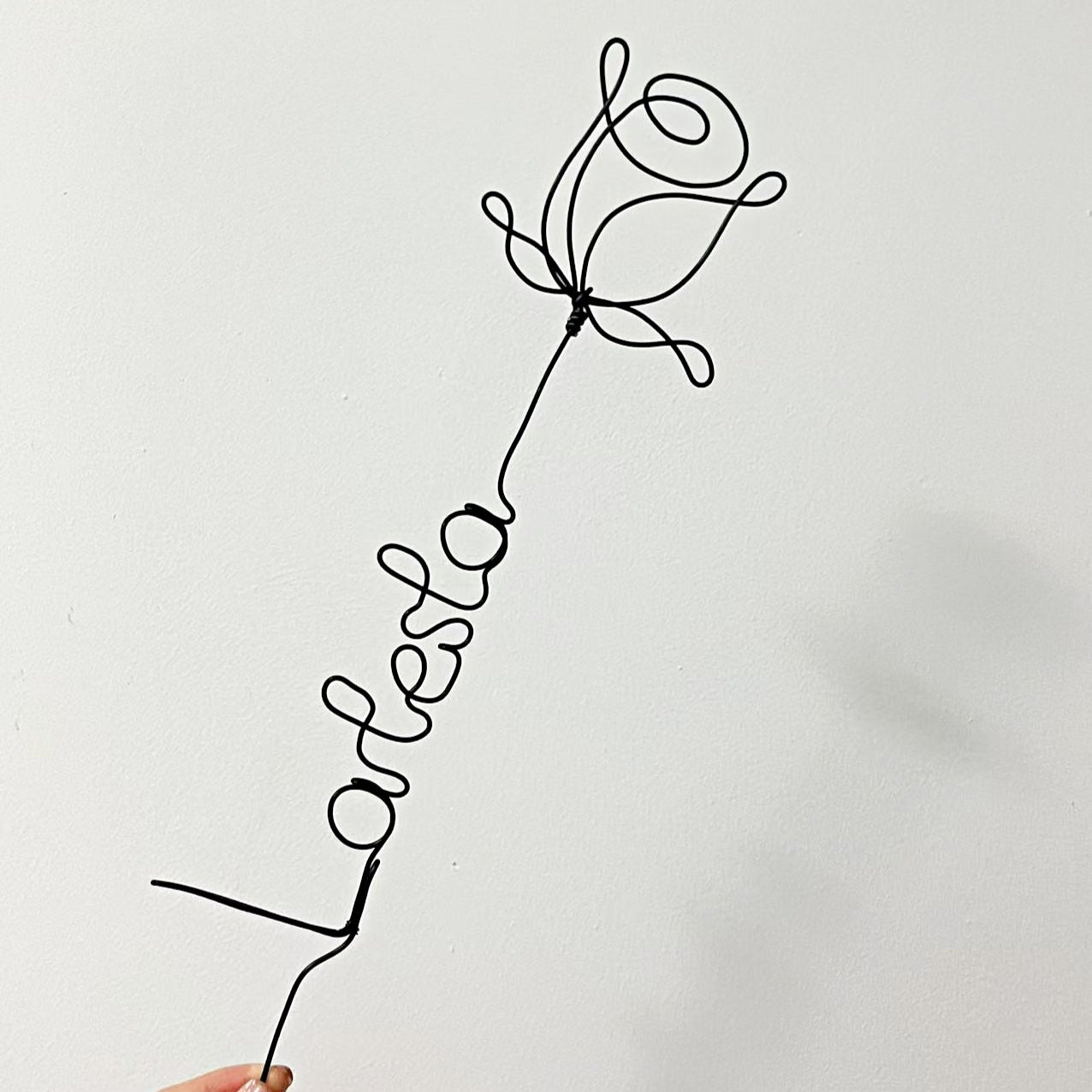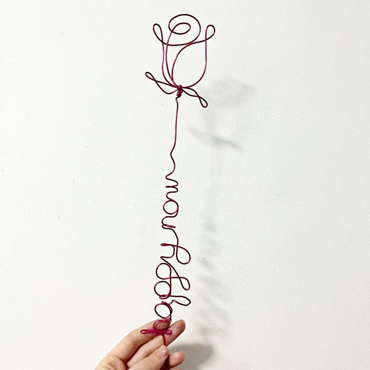 名前、言葉、イニシャルをつけてパーソナライズできるワイヤーバラ。単独で花瓶に飾るもよし、ドライフラワーとともに寛ぐもよし。お気に入りの部屋に飾るのもいいですし、写真立ての近くに飾っても素敵です。花瓶に入れる場合は、茎の先を曲げるか、砂や小石で重しをつけてください。
