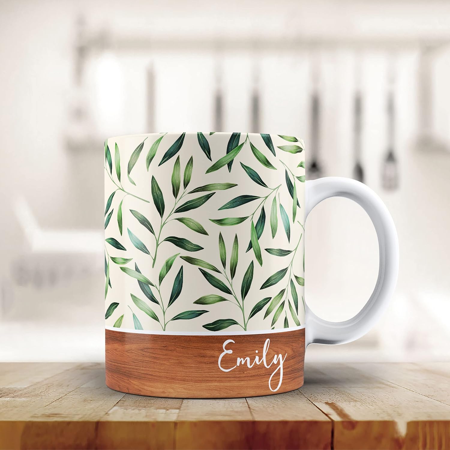 パーソナライズされた花と葉のパターン 木製スタイルの名前入り「Leaves L.Green」
