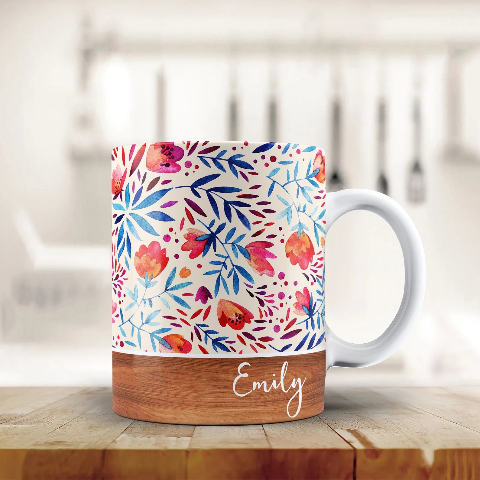 パーソナライズされた花と葉のパターン 木製スタイルの名前入り「Vibrant Floral」