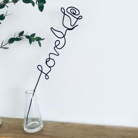 名前、言葉、イニシャルをつけてパーソナライズできるワイヤーバラ。単独で花瓶に飾るもよし、ドライフラワーとともに寛ぐもよし。お気に入りの部屋に飾るのもいいですし、写真立ての近くに飾っても素敵です。花瓶に入れる場合は、茎の先を曲げるか、砂や小石で重しをつけてください。