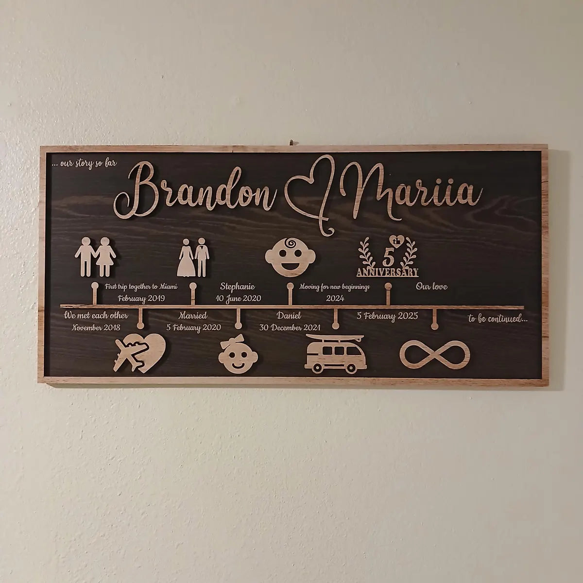 初めての出会いから最新の冒険まで、それぞれの重要なイベントは、クラシックなダークウッドの背景にかわいいアイコンで表現され、タイムレスでエレガントな魅力を与えています。
