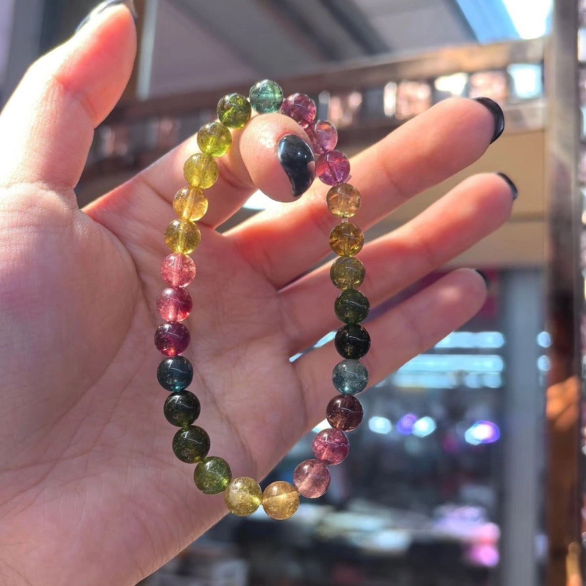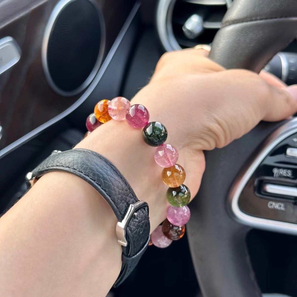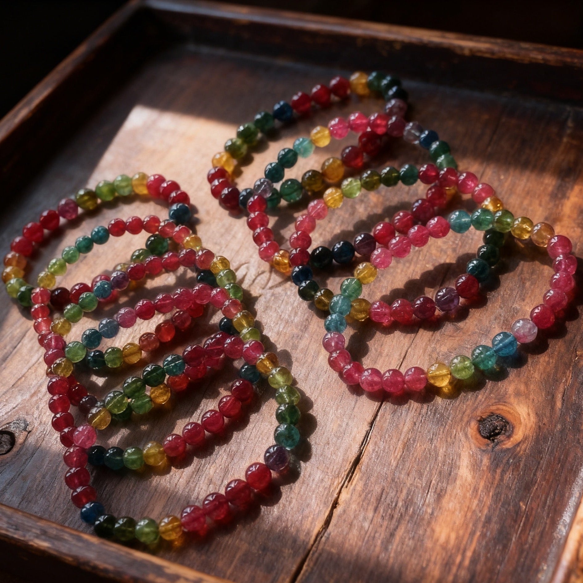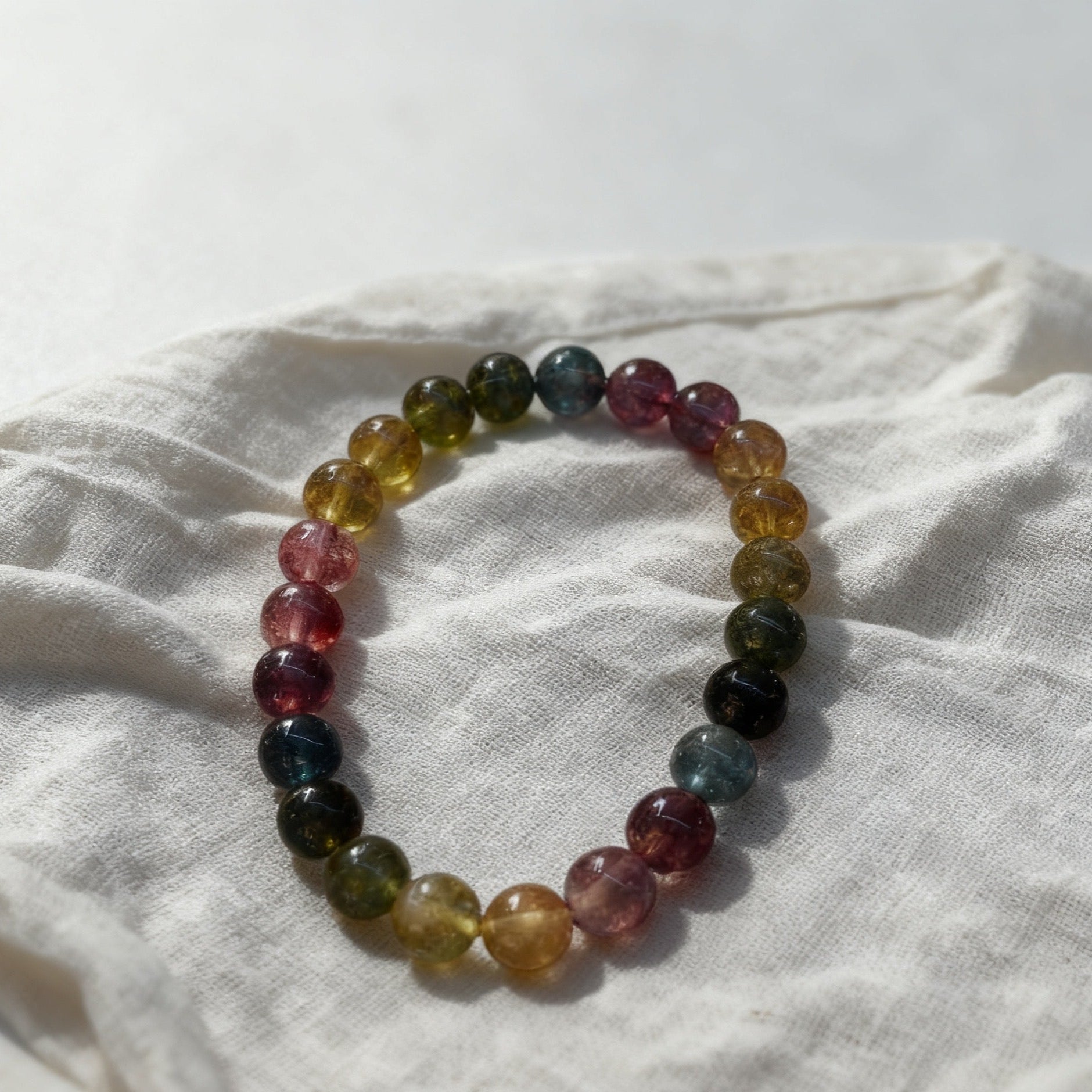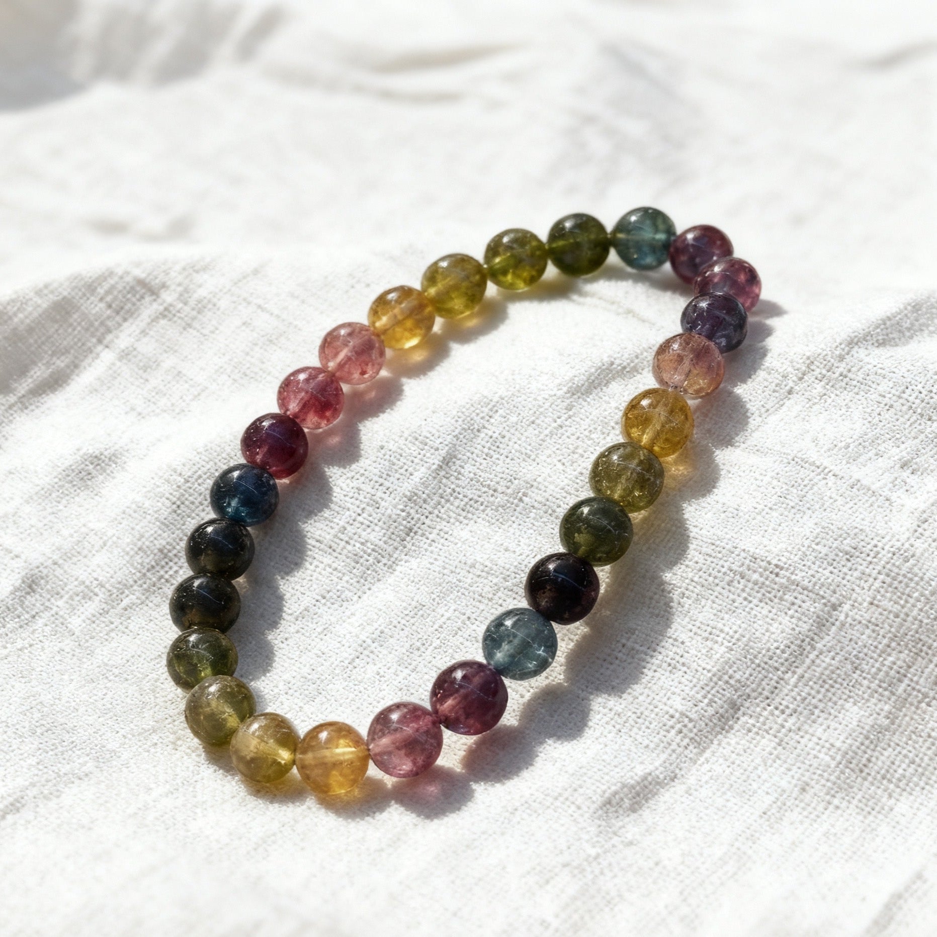 ひと粒ひと粒が異なる色合いを持つ、カラフルな天然トルマリンを集めたブレスレット。虹のように多彩なエネルギーが、心に調和をもたらし、創造性と前向きな気持ちを目覚めさせます。