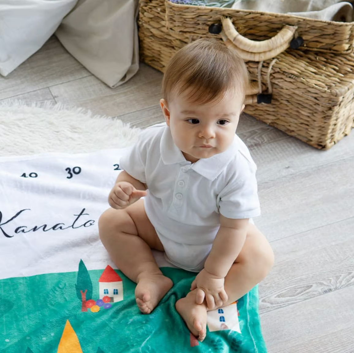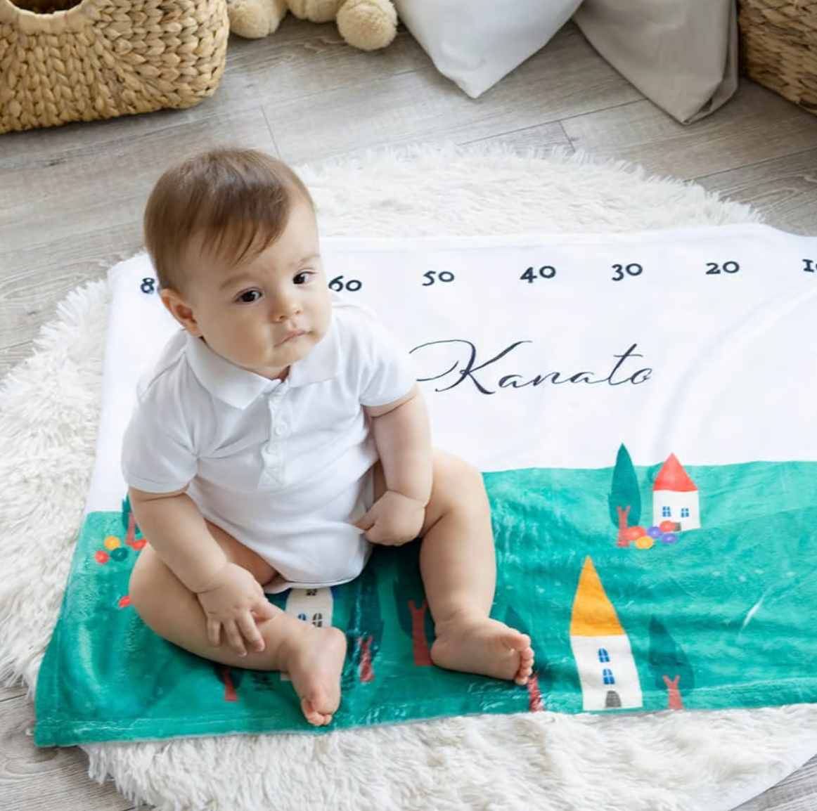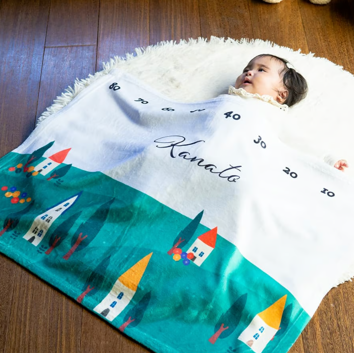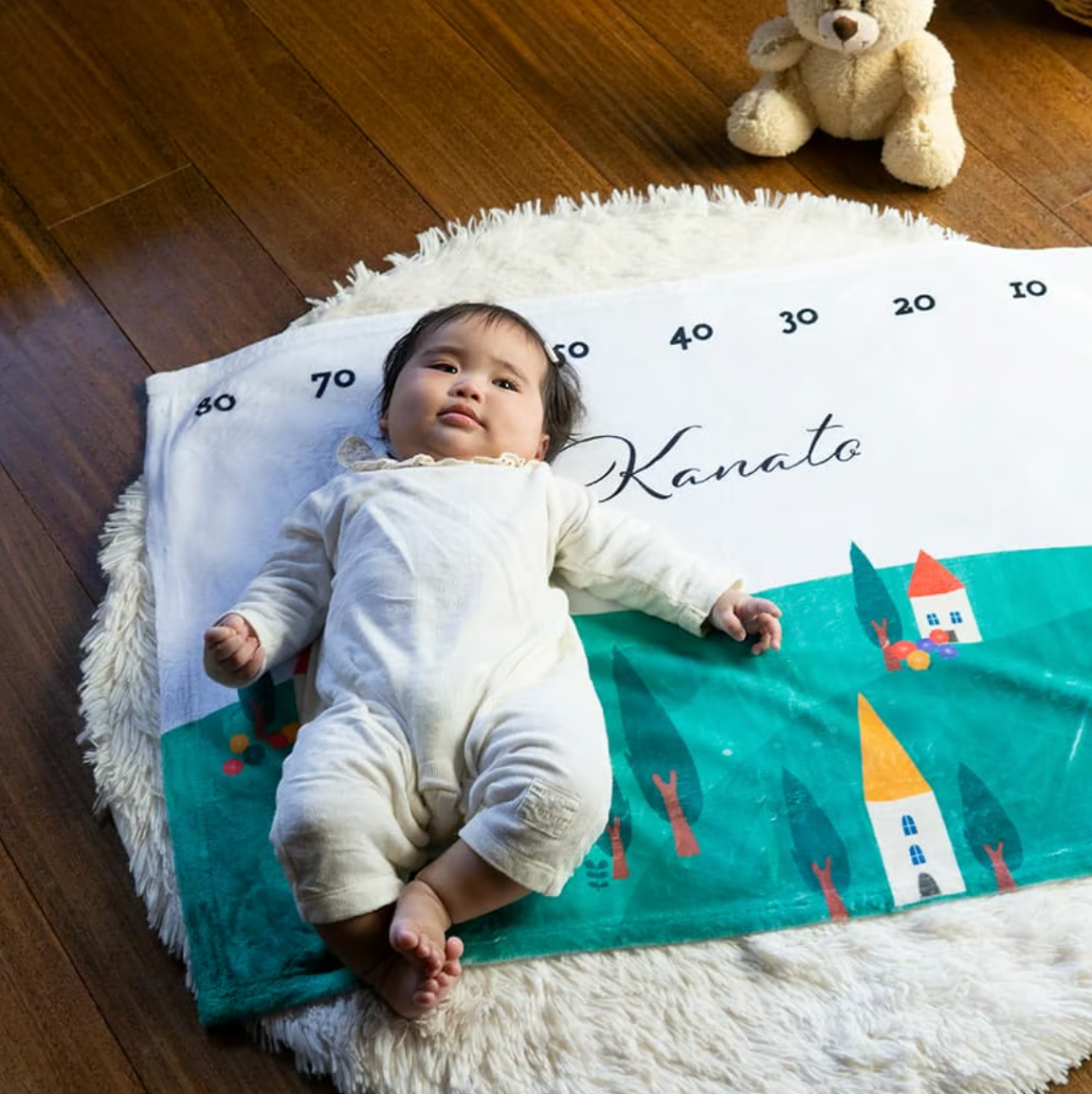 80cmまでの目盛りがデザインされていて、記念日フォトや月齢フォトにピッタリです。 日々成長していく愛しい我が子。 ブランケットに寝かせてあげると一目でわかるその成長。 もうこんなに大きくなったのね、などとママやパパのうれしい会話が聞こえてきそうですね。