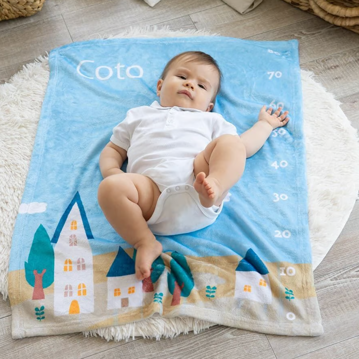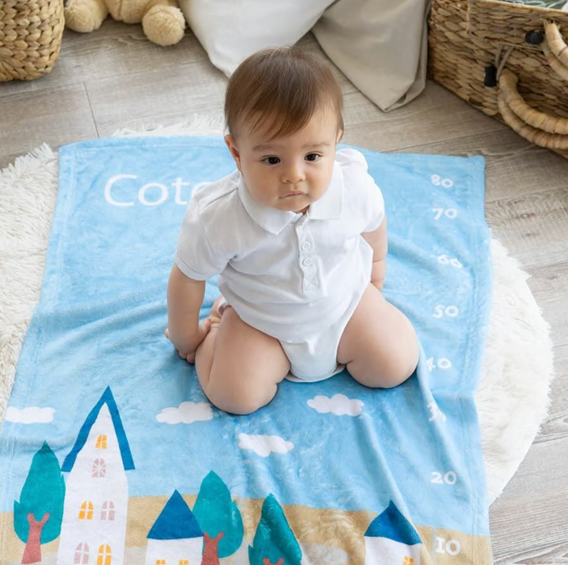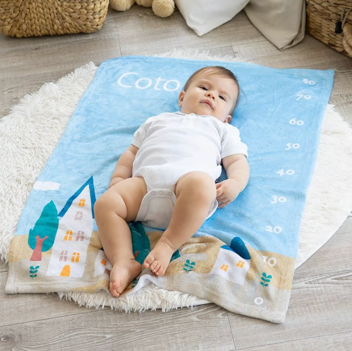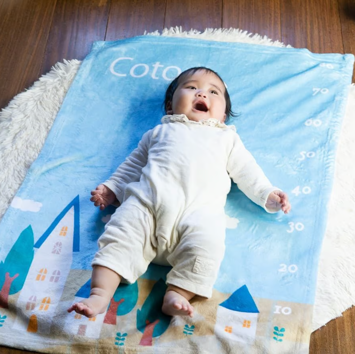80cmまでの目盛りがデザインされていて、記念日フォトや月齢フォトにピッタリです。 日々成長していく愛しい我が子。 ブランケットに寝かせてあげると一目でわかるその成長。 もうこんなに大きくなったのね、などとママやパパのうれしい会話が聞こえてきそうですね。